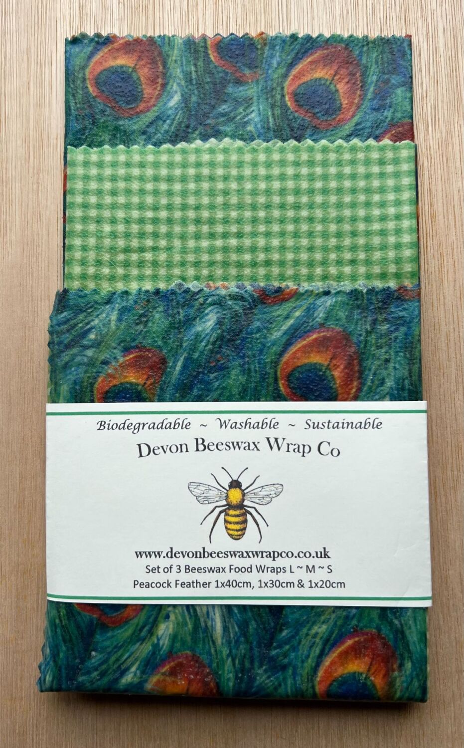 - A set of 3 Devon Beeswax Wraps Large, Medium and Small Peacock Feathers & Gingham Green